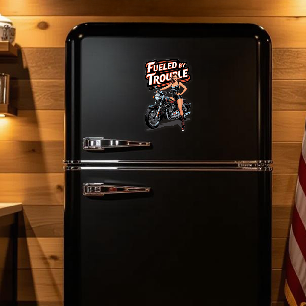 Biker Babe Pin-Up Sticker, Fueled By Trouble, Gift for Rebel Rule-Breakers, Glossy Vinyl Decal Pinup Motorcycle Helmet Laptop Sticker
